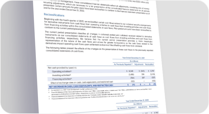 PARTIV Note1—OverviewandSummaryofSignificantAccountingPolicies PayPalHoldings,Inc. NotestoConsolidatedFinancialStatements—(Continued) of accounting in long-term investments on our consolidated balance sheets. Our maximum exposure to loss related to our nonconsolidatedVIEs, which represents funded commitments and any future funding commitments, was $232 million and $205millionasofDecember31,2022and2021,respectively. In the opinion of management, these consolidated financial statements reflect all adjustments, consisting only of normal recurring adjustments, which are necessary for a fair presentation of the consolidated financial statements for all periods presented. Certain amounts for prior years have been reclassified to conform to the financial statement presentation as of andfortheyearendedDecember31,2022. Reclassifications Beginning with the fourth quarter of 2022, we reclassified certain cash flows related to our collateral security arrangements for derivative instruments from cash flows from operating activities to cash flows from investing activities and cash flows from financing activities within the consolidated statements of cash flows. Prior period amounts have been reclassified to conformtothecurrentperiodpresentation. The current period presentation classifies all changes in collateral posted and collateral received related to derivative instruments on our consolidated statements of cash flows as cash flows from investing activities and cash flows from financing activities, respectively. We believe that the current period presentation provides a more meaningful representation of the nature of the cash flows and allows for greater transparency as the cash flows related to the derivativesimpactoperatingcashflowsuponsettlementexclusiveoftheoffsettingcashflowsfromcollateral. The following tables present the effects of the changes on the presentation of these cash flows to the previously reported consolidatedstatementsofcashflows: YearEndedDecember31,2021 (In millions) AsPreviouslyReported(1) Adjustments Reclassified Netcashprovidedby(usedin): (2) Operatingactivities $ 6,340 $ (543) $ 5,797 (3) Investingactivities (5,485) 336 (5,149) (4) Financingactivities (764) 207 (557) Effect of exchangeratesoncash,cashequivalents,andrestrictedcash (102) — (102) NETDECREASEINCASH,CASHEQUIVALENTS,ANDRESTRICTEDCASH $ (11) $ — $ (11) (1) Asreportedinour2021Form10-KfiledwiththeSEConFebruary3,2022. (2) Financialstatementlinesimpactedinoperatingactivitieswere“Othercurrentassetsandnon-currentassets”and“Othercurrentliabilitiesandnon-currentliabilities,”which decreasedby$336millionand$207million,respectively,toarriveatthereclassifiedamounts. (3) Financialstatementlineimpactedininvestingactivitieswas “Collateralpostedrelatedtoderivativeinstruments,net.” (4) Financialstatementlineimpactedinfinancingactivitieswas “Collateralreceivedrelatedtoderivativeinstruments,net.” YearEndedDecember31,2020 (In millions) AsPreviouslyReported(1) Adjustments Reclassified Netcashprovidedby(usedin): (2) $ 5,854 $ 365 $ 6,219 Operatingactivities (3) (16,218) (327) (16,545) Investingactivities (4) 12,492 (38) 12,454 Financingactivities Effect of exchangeratesoncash,cashequivalents,andrestrictedcash 169 — 169 NETINCREASEINCASH,CASHEQUIVALENTS,ANDRESTRICTEDCASH $ 2,297 $ — $ 2,297 (1) Asreportedinour2021Form10-KfiledwiththeSEConFebruary3,2022. (2) Financialstatementlinesimpactedinoperatingactivitieswere“othercurrentassetsandnon-currentassets”and“othercurrentliabilitiesandnon-currentliabilities,”whichincreased by$327millionand$38million,respectively,toarriveatthereclassifiedamounts. (3) Financialstatementlineimpactedininvestingactivitieswas “Collateralpostedrelatedtoderivativeinstruments,net.” (4) Financialstatementlineimpactedinfinancingactivitieswas “Collateralreceivedrelatedtoderivativeinstruments,net.” 64 •2022AnnualReport