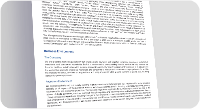 PARTII Item7. ManagementsDiscussionandAnalysisofFinancialConditionandResultsofOperations Item7.ManagementsDiscussionandAnalysisofFinancialConditionand Results of Operations This Form 10-K contains forward-looking statements within the meaning of Section 27A of the Securities Act of 1933 and Section 21E of the Securities Exchange Act of 1934, including statements that involve expectations, plans, or intentions (such as those relating to future business, future results of operations or financial condition, new or planned features or services, mergers or acquisitions, or management strategies). These forward-looking statements can be identified by words such as “may,” “will,” “would,” “should,” “could,” “expect,” “anticipate,” “believe,” “estimate,” “intend,” “continue,” “strategy,” “future,” “opportunity,” “plan,” “project,” “forecast,” and other similar expressions. These forward-looking statements involve risks and uncertainties that could cause our actual results and financial condition to differ materially from those expressed or implied in our forward-looking statements. Such risks and uncertainties include, among others, those discussed in “Item 1A. Risk Factors” of this Form 10-K, as well as in our consolidated financial statements, related notes, and the other information appearingin this report and our other filings with the Securities and Exchange Commission (“SEC”). We do not intend, and undertake no obligation except as required by law, to update any of our forward-looking statements after the date of this report to reflect actual results, new information, or future events or circumstances. Given these risks and uncertainties, readers are cautioned not to place undue reliance on such forward-looking statements. You should read the following “Managements Discussion and Analysis of Financial Condition and Results of Operations” in conjunction with the audited consolidated financial statements and the related notes that appear in this report. Unless otherwise expressly stated or the context otherwise requires, references to “we,” “our,” “us,” “the Company,” and “PayPal” refer to PayPal Holdings, Inc. and its consolidated subsidiaries. This Managements Discussion and Analysis of Financial Condition and Results of Operations focuses on a discussion of 2022 results as compared to 2021 results. For a discussion of 2021 results as compared to 2020 results, see “Item 7. ManagementsDiscussionand Analysis of Financial Condition and Results of Operations” within our Form 10-K for the year endedDecember31,2021filedwiththeSEConFebruary3,2022. BusinessEnvironment TheCompany We are a leading technology platform that enables digital payments and simplifies commerce experiences on behalf of merchants and consumers worldwide. PayPal is committed to democratizing financial services to help improve the financial health of individuals and to increase economic opportunity for entrepreneurs and businesses of all sizes around the world. Our goal is to enable our merchants and consumers to manage and move their money anywhere in the world in the markets we serve, anytime, on any platform, and using any device when sending payments or getting paid, including person-to-personpayments. RegulatoryEnvironment Weoperate globally and in a rapidly evolving regulatory environment characterized by a heightened focus by regulators globally on all aspects of the payments industry, including countering terrorist financing, anti-money laundering, privacy, cybersecurity, and consumer protection. The laws and regulations applicable to us, including those enacted prior to the advent of digital payments, continue to evolve through legislative and regulatory action and judicial interpretation. New or changinglawsandregulations,includingchangestotheirinterpretationandimplementation,aswellasincreasedpenalties and enforcement actions related to non-compliance, could have a material adverse impact on our business, results of operations, and financial condition. We monitor these areas closely and are focused on designing compliant solutions for ourcustomers. InformationSecurity Information security risks for global payments and technology companies like us have increased significantly in recent years. Although we have developed systems and processes designed to protect the data we manage, prevent data loss and other security incidents, and effectively respond to known and potential risks, and expect to continue to expend significant resources to bolster these protections, we remain subject to these risks and there can be no assurance that our security measures will provide sufficient security or prevent breaches or attacks. For additional information regarding our information security risks, see “Item 1A. Risk Factors—Cyberattacks and security vulnerabilities could result in serious harm to our reputation, business, and financial condition.” 30 •2022AnnualReport