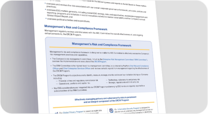CORPORATEGOVERNANCE BoardOversight • overseesandmonitorstheCompanysstrategiesrelatedtotalentmanagement,includingtherecruitmentandretentionof keytalent, pay equity, corporate culture, DIE&B and other key human capital management programs and initiatives; and • overseesexecutivesuccessionplanning. GovernanceCommittee TheGovernanceCommitteeisprimarilyresponsibleforthefollowingareasandreportstothefullBoardonthesematters onaregularbasis: • overseesandreviewstherisksassociatedwithouroverallcorporategovernanceframework,principles,policiesand practices; • overseesESGmattersgenerally,includingoverallESGstrategy,risksandopportunities,stakeholderengagementand reporting, programsandinitiativesin social innovationand environmentalsustainabilityand the Companysannual GlobalImpactReport;and • overseespoliticalactivitiesand expenditures. ManagementsRiskandComplianceFramework ManagementregularlyreviewsanddiscusseswiththeARCCommitteetheoveralleffectivenessof,andongoing enhancementsto,theERCMProgram. Managements Risk and Compliance Framework Managements risk and compliance framework is designed to enable the ARC Committee to effectively oversee the Companys risk management practices and capabilities. • The Companys risk management committees, including the Enterprise Risk Management Committee (“ERM Committee”), oversee the implementation and execution of the ERCM Program. • The ERM Committee is the highest-level risk management committee, is co-chaired by PayPals Chief Risk and Compliance Ofcer and Chief Enterprise Services Ofcer and reviews periodic reports from management regarding the effectiveness of the ERCM Program. • The ERCM Programs objectives are to identify, measure, manage, monitor and report key risk factors facing our Company including: — Financial crime and regulatory compliance risk — Technology, cybersecurity and privacy risk — Operational, portfolio and capital risk — Strategic, reputational and third-party risk • Key ESG considerations are integrated into our ERCM Program and emerging ESG trends are regularly reported to a subcommittee of the ERM Committee. Effectively managing privacy and cybersecurity risks is paramount and an integral component of the ERCM Program Our Global Privacy Program is based on eight data Our Information Security Program is designed to management principles, including choice and enable robust cybersecurity management across our consent, notice and transparency, security and data lifecycle global enterprise and support the Company in identifying, management, that serve as the basis for enterprise-wide protecting, detecting, responding to and recovering from standards, programs and trainings. cybersecurity threats. —Our Global Privacy and Data Management Team, led by our —The risk-driven program, led by our Chief Information Security Chief Privacy Officer and Global Head of Data Management, Officer, is ISO 27001 certified and aligned with other industry collaborates with dedicated teams integrated throughout our frameworks and best practices. business to foster a “Data Hygiene by Default” and “Privacy by —We institute 24/7 monitoring and measurement through our Design” culture throughout the Company. PayPal Command Center and PayPal Cyber Defense Center, —This includes mandatory employee and contractor training and require employee and contractor training and promote regular education, issue management and privacy risk assessments. cybersecurity awareness and educational programs for our employees, customers and broader ecosystem. 28 •2023ProxyStatement