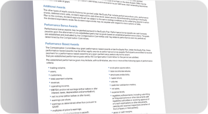 PROPOSAL3:VOTETOAPPROVEPAYPALHOLDINGS,INC.2015EQUITYINCENTIVEAWARDPLAN,ASAMENDEDANDRESTATED Increasing the NumberofSharesReservedforIssuanceundertheEquityPlan following the maturity date, we will transfer to the participant one unrestricted,fully transferable share of common stock for eachRSUscheduledtobepaidoutandnotpreviouslyforfeited(subjecttoapplicabletaxwithholdingrequirements). StockAppreciationRights Stockappreciationrights(“SARs”)maybegrantedpursuanttotheEquityPlan.TheexercisepriceofallSARsgranted pursuanttotheEquityPlanwillnotbelessthan100%ofthefairmarketvalueofashareonthedateofgrant.SARsmaybe exercisedasdeterminedbytheCompensationCommittee,butinnoeventmayanSARhaveatermextendingbeyondten yearsfromthedateofgrant. AdditionalAwards TheothertypesofequityawardsthatmaybegrantedundertheEquityPlanincludeperformanceshareunits,performance shares,deferredstockunits,dividendequivalentsandotherstock-basedawards.NotwithstandinganythingintheEquity Plantothecontrary,dividendequivalentswillbesubjecttothesamevestingconditionsastheunderlyingawardstowhich thedividendequivalentsrelate.NodividendequivalentsmaybepayablewithrespecttostockoptionsorSARs. PerformanceBonusAwards PerformancebonusawardsmaybegrantedpursuanttotheEquityPlan.Performancebonusawardsarecashbonuses payableupontheattainmentofpre-establishedperformancegoalsbasedonestablishedperformancecriteria.Thegoals are establishedandevaluatedbytheCompensationCommitteeandmayrelatetoperformanceoveranyperiodsas determinedbytheCompensationCommittee. Performance-BasedAwards TheCompensationCommitteemaygrantperformance-basedawardsundertheEquityPlan.UndertheEquityPlan,these performance-basedawardsmaybeeitherequityawardsorperformancebonusawards.Participantsareentitledtoreceive paymentforaperformance-basedawardforanygivenperformanceperiodonlytotheextent that pre-establishedperformancegoalssetbytheCompensationCommitteefortheperiodaresatisfied. Pre-establishedperformancegoalsmayinclude,withoutlimitation,anyoneormoreofthefollowingtypesofperformance criteria: • trading volume; • stockpriceappreciation; • users; • total stockholderreturns; • customers; • employeeproductivity; • total paymentvolume; • marketshare; • revenue; • volume; • operatingincome; • customersatisfactionmetrics; • EBITDAand/ornetearnings(eitherbeforeorafter • net sales; interest, taxes, depreciation and amortization); • expenselevels; • net income(eitherbeforeoraftertaxes); • regulatoryachievements(includingsubmitting • earningspershare; or filing applications or other documents with • earningsasdeterminedotherthanpursuantto regulatoryauthoritiesor receivingapprovalof GAAP; anysuchapplicationsorotherdocuments, • multiples of price to earnings; passingpre-approvalinspections(whetherof • multiples of price/earningsto growth; theCompanyorthirdparties)); • return on net assets; • grossorcashmargins; • return on gross assets; • sales or licenses of the Companysassets, • return on equity; includingits intellectual property, whether in a particular jurisdiction or territory or globally, or • return on investedcapital; throughpartneringtransactions; • stockprice; • implementation,completionorattainmentof • cashflow(includingoperatingcashflowand objectiveswithrespecttoresearch, free cash flow); development,commercialization,productsor • net or operating margins; projects, productionvolumelevels,acquisitions • economicprofit; anddivestituresandrecruitingandmaintaining personnel; 90 •2023ProxyStatement