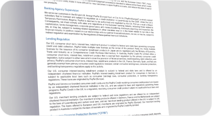 PARTI Item1. Business Secteur Financier (the “CSSF”), the U.K. Financial Conduct Authority (“FCA”), the Australian Prudential Regulation Authority, the Peoples Bank of China, the Monetary Authority of Singapore, the Reserve Bank of India, the Central Bank of Russia, and the Central Bank of Brazil have asserted jurisdiction over some or all of our activities in their respective jurisdictions. This list is not exhaustive, and there are numerous other regulatory agencieswhich have assertedor may assertjurisdictionover our activities. In addition, financial services regulators in various jurisdictions, including the U.S. and the European Union (“EU”), have implementedauthenticationrequirementsforbanksandpaymentprocessorsintendedtoreduceonlinefraud,whichcould imposesignificant costs, make it more difficult for new customers to open PayPal accounts, and reduce the ease of use of ourproducts. BankingAgencySupervision WeserveourcustomersintheEUandU.K.throughPayPal(Europe)S.à.r.l.etCie,S.C.A.(“PayPal(Europe)”),awholly-owned subsidiary that is licensed and subject to regulation as a credit institution in Luxembourg by the CSSF. Under the U.K.s Temporary Permissions Regime, PayPal is deemed to be authorized and regulated by the U.K. FCA as a result of Brexit. Consequently, we must comply with rules and regulations of the European banking industry, including those related to capitalization, funds management, corporate governance,anti-money laundering, disclosure, reporting,and inspection.We are, or may be, subject to banking-related regulations in other countries now or in the future related to our role in the financial industry. In addition, based on our relationships with our partner financial institutions, we are, or may be, subject to indirect regulation and examinationby the regulatorsof these partnerfinancial institutions. LendingRegulation Our U.S. consumer short-term, interest-free, installment product is subject to federal and state laws governing consumer credit and debt collection. PayPal holds multiple state licenses as the lender of this product. Paidy, Inc. holds multiple licenses for the issuance of its consumer installment products in Japan and is registered with the Ministry of Economy, Trade and Industry as a Comprehensive Credit Purchase Intermediary. In Australia, PayPal Credit Pty Limited offers a consumer short-term, interest-free, installment product that is exempt from regulation by the primary consumer credit legislation, but is subject to other laws which cover the provision of financial services, credit reporting, debt collection, and privacy. PayPals consumer short-term, interest-free, installment products in the U.K., France, Germany, Spain, and Italy are generally exempt from primary consumercreditlegislation;however,certainconsumerlendinglaws,consumerprotection, andbankingtransparencyregulationsapplytothisactivity. Our U.S. consumer interest-bearing installment product is subject to federal and state laws and is offered by an independent chartered financial institution. PayPals interest-bearing installment product for consumers in Germany is subject to applicable local laws such as consumer (lending) laws, consumer protection, or banking transparency regulations. These loans are originated by PayPal (Europe). PayPal and Venmo co-brandedconsumercreditcardsandthePayPalCreditrevolvingconsumercreditproductareissued by an independent chartered financial institution in the U.S., and are subject to laws and regulations governing these programs. PayPal Credit in the U.K. is a regulated, revolving consumer credit product subject to applicable local laws and regulations. Our U.S. merchant lending products are subject to federal and state regulations and are offered by an independent chartered financial institution. Our merchant lending products offered in Germany, France and the Netherlands are subject to the laws of Luxembourg and certain local laws, and our merchant lending product offered in the U.K. is subject to U.K. regulation. The loans offered to European and U.K. merchants are originated by PayPal (Europe). Our merchant lending productinAustraliais subjectto the laws of Australia and originatedby PayPal Credit Pty Limited. ConsumerFinancialProtectionBureau(“CFPB”) TheCFPBhassignificantauthority to regulate consumer financial products in the U.S., including consumer credit, deposits, payments, and similar products. As a large market participant of remittance transfers, the CFPB has direct supervisory authority over our business. The CFPB and similar regulatory agencies in other jurisdictions may have broad consumer protection mandates that could result in the promulgation and interpretation of rules and regulations that may affect our business. Anti-MoneyLaundering,Counter-TerroristFinancing,andSanctions PayPal is subject to anti-money laundering (“AML”) laws and regulations in the U.S. and other jurisdictions, as well as laws designedtopreventtheuseofthefinancialsystemstofacilitateterroristactivities.Our AML programis designedto prevent our paymentsplatform from being used to facilitate money laundering, terrorist financing, and other illicit activities, or to do 10 •2022AnnualReport