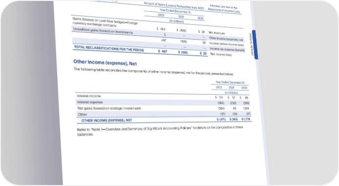 PARTIV Note7—OtherFinancialStatementDetails PayPalHoldings,Inc. NotestoConsolidatedFinancialStatements—(Continued) Thefollowingtableprovidesdetailsaboutreclassificationsout of AOCIfortheperiodspresentedbelow: AffectedLineIteminthe Details aboutAOCIComponents AmountofGains(Losses)ReclassifiedfromAOCI StatementsofIncome(Loss) YearEndedDecember31, 2022 2021 2020 (In millions) Gains(losses)oncashflowhedges—foreign currencyexchangecontracts $ 462 $ (190) $ 20 Netrevenues ANNU Unrealizedgains(losses)oninvestments 5 — — Otherincome(expense),net AL 467 (190) 20 Incomebeforeincometaxes REPOR — — — Incometaxexpense(benefit) TOTALRECLASSIFICATIONSFORTHEPERIOD $ 467 $ (190) $ 20 Netincome(loss) T OtherIncome(expense),Net Thefollowingtablereconcilesthecomponentsofotherincome(expense),netfortheperiodspresentedbelow: YearEndedDecember31, 2022 2021 2020 (In millions) Interest income $ 174 $ 57 $ 88 Interest expense (304) (232) (209) Netgains(losses)onstrategicinvestments (304) 46 1,914 Other (37) (34) (17) OTHERINCOME(EXPENSE),NET $ (471) $(163) $1,776 Refer to “Note 1—OverviewandSummaryofSignificantAccountingPolicies”fordetailsonthecompositionofthese balances. •2022AnnualReport 83