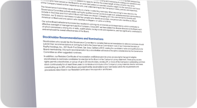 PROPOSAL1:ELECTIONOFDIRECTORS Director Nominees FocusonBoardRefreshmentandDiversity TheGovernanceCommitteeregularlyoverseesandplansfordirectorsuccessionandBoardrefreshment.TheBoardvalues successionandrefreshmentovertimeascriticalcomponentstomaintaininganappropriatebalanceoftenure,diversity, skills and experienceneededtopromoteandsupporttheCompanyslong-termstrategy.TheBoardbelievesthathavinga mixofexperienceddirectorswithadeepunderstandingoftheCompanyandnewerdirectorswhobringfreshperspectives andinnovativeideasprovidessignificantbenefitstotheCompanyindrivingandoverseeingitsstrategyandoperationsand managingkeyrisks.TheBoarddoesnotbelieveinaspecificlimitfortheoveralllengthoftimeadirectormayserve. DirectorswhohaveservedontheBoardforanextendedperiodcanprovidevaluableinsightintotheoperationsandfuture of the Companybasedontheirexperiencewith,andunderstandingof,theCompanyshistory,policiesandobjectives. TheGovernanceCommitteevaluesdiversityasafactorinselectingnominees.Whensearchingfornewdirectors,the GovernanceCommitteeactivelyseeksouthighlyqualifiedwomenandindividualsfromunderrepresentedcommunitiesto includein the initial pool from which Board nomineesare chosen.In keepingwith this commitmentto diversityand inclusion, our 12 director nominees include four people who identify as women, one person who identifiesas African AmericanorBlackandonepersonwhoidentifiesasHispanicorLatinxandWhite. OuractiveBoardrefreshmentprocesshasresultedinastrongmixofdiversityandindependence,whichcontributesto effective oversight of managementandtheCompany.Since2017,wehaveaddedfivediversedirectorstotheBoard,each of whompossessesastrongmixofskills,qualifications,backgroundsandexperience,andhassignificantlycontributedto andenhancedtheoveralleffectivenessoftheBoard. StockholderRecommendationsandNominations StockholderswhowouldliketheGovernanceCommitteetoconsidertheirrecommendationsfordirectornomineesshould submittheirrecommendationsinwritingbymailtotheGovernanceCommitteeincareofourCorporateSecretaryat PayPalHoldings,Inc.,2211 NorthFirst Street,San Jose, California 95131, stating the candidatesname and qualificationsfor Boardmembership.AnysuchrecommendationbyastockholderwillreceivethesameconsiderationbytheGovernance Committeeasothersuggestednominees. In addition, our Restated Certificate of Incorporation and Bylaws provide proxy access rights that permit eligible stockholderstonominatecandidatesforelectiontotheBoardintheCompanysproxystatement.Theseproxyaccess rights permit a stockholder,or group of up to 20 stockholders,owning 3% or more of the Companysoutstandingcommon stockcontinuouslyforatleastthreeyearstonominateandincludeintheCompanysproxymaterialsdirectornominees constitutingup to 20% of the Board, providedthat the stockholder(s)and nominee(s)satisfythe requirementsand proceduresdescribedinourRestatedCertificateofIncorporationandBylaws. 14 •2023ProxyStatement