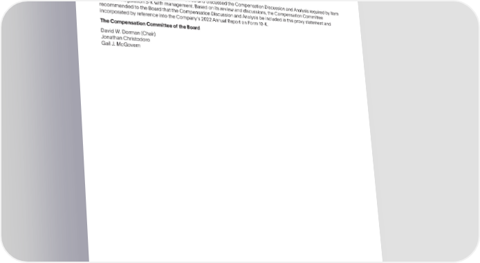 COMPENSATIONDISCUSSIONANDANALYSIS OtherCompensationPracticesandPolicies Weaccountforstock-basedcompensationinaccordancewithFASBASCTopic718,whichrequiresustorecognize compensationexpenseforshare-basedpayments,includingstockoptions,RSUs,PBRSUs,sharesofcommonstockand otherformsofequitycompensation. CompensationCommitteeReport TheCompensationCommitteehasreviewedanddiscussedtheCompensationDiscussionandAnalysisrequiredbyItem 402(b) of Regulation S-K with management.Basedonitsreviewanddiscussions,theCompensationCommittee recommendedtotheBoardthattheCompensationDiscussionandAnalysisbeincludedinthisproxystatementand incorporatedbyreferenceintotheCompanys2022AnnualReportonForm10-K. TheCompensationCommitteeoftheBoard DavidW.Dorman(Chair) JonathanChristodoro Gail J. McGovern 70 •2023ProxyStatement