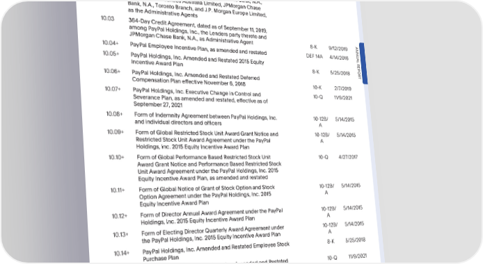 PARTIV IndexofExhibits IncorporatedbyReference Exhibit Filed with this Number Exhibit Description Form10-K Form DateFiled 10.02 CreditAgreement,datedasofSeptember11,2019,among 8-K 9/12/2019 PayPalHoldings,Inc.,theDesignatedBorrowerspartythereto, theLenderspartytheretoandJPMorganChaseBank,N.A., J.P. MorganSecuritiesAustraliaLimited,JPMorganChase Bank,N.A.,TorontoBranch,andJ.P.MorganEuropeLimited, astheAdministrativeAgents 10.03 364-DayCreditAgreement,datedasofSeptember11,2019, amongPayPalHoldings,Inc.,theLenderspartytheretoand JPMorganChaseBank,N.A.,asAdministrativeAgent 8-K 9/12/2019 ANNU 10.04+ PayPalEmployeeIncentivePlan,asamendedandrestated DEF14A 4/14/2016 AL 10.05+ PayPalHoldings,Inc.AmendedandRestated2015Equity REPOR IncentiveAwardPlan 8-K 5/25/2018 10.06+ PayPalHoldings,Inc.AmendedandRestatedDeferred T CompensationPlaneffectiveNovember6,2018 10-K 2/7/2019 10.07+ PayPalHoldings,Inc.ExecutiveChangeinControland 10-Q 11/9/2021 SeverancePlan,asamendedandrestated,effectiveasof September27,2021 10.08+ FormofIndemnityAgreementbetweenPayPalHoldings,Inc. 10-12B/ 5/14/2015 andindividualdirectorsandofficers A 10.09+ FormofGlobalRestrictedStockUnitAwardGrantNoticeand 10-12B/ 5/14/2015 RestrictedStockUnitAwardAgreementunderthePayPal A Holdings,Inc. 2015EquityIncentiveAwardPlan 10.10+ FormofGlobalPerformanceBasedRestrictedStockUnit 10-Q 4/27/2017 AwardGrantNoticeandPerformanceBasedRestrictedStock Unit AwardAgreementunderthePayPalHoldings,Inc.2015 Equity Incentive AwardPlan, as amendedandrestated 10.11+ FormofGlobalNoticeofGrantofStockOptionandStock 10-12B/ 5/14/2015 OptionAgreementunderthePayPalHoldings,Inc.2015 A Equity Incentive AwardPlan 10.12+ FormofDirectorAnnualAwardAgreementunderthePayPal 10-12B/ 5/14/2015 Holdings,Inc. 2015EquityIncentiveAwardPlan A 10.13+ FormofElectingDirectorQuarterlyAwardAgreementunder 10-12B/ 5/14/2015 thePayPalHoldings,Inc.2015EquityIncentiveAwardPlan A 10.14+ PayPalHoldings,Inc.AmendedandRestatedEmployeeStock 8-K 5/25/2018 PurchasePlan 10.15+ AmendmenttoPayPalHoldings,Inc.AmendedandRestated 10-Q 11/9/2021 EmployeeStockPurchasePlan 10.16+ PayPalHoldings,Inc.2022InducementPlan 10-Q 8/2/2022 10.17+ Offer Letter dated September29, 2014betweeneBayInc.and 10-12B/ 5/14/2015 DanielSchulman A 10.18+ AmendmentdatedDecember31,2014toOfferLetter 10-12B/ 5/14/2015 betweeneBayInc.andDanielSchulman A •2022AnnualReport 119