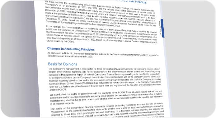 PARTIV ReportofIndependentRegisteredPublicAccountingFirm ReportofIndependentRegisteredPublicAccountingFirm TotheBoardofDirectorsandStockholdersofPayPalHoldings,Inc. OpinionsontheFinancialStatementsandInternalControloverFinancial Reporting We have audited the accompanying consolidated balance sheets of PayPal Holdings, Inc. and its subsidiaries (the “Company”) as of December 31, 2022 and 2021, and the related consolidated statements of income (loss), of comprehensive income (loss), of stockholders equity and of cash flows for each of the three years in the period ended December 31, 2022, including the related notes and schedule of valuation and qualifying accounts for each of the three years in the period ended December 31, 2022 listed in the index appearing under Item 15(a)(2) (collectively referred to as ANNU the “consolidated financial statements”). We also have audited the Companys internal control over financial reporting as of December 31, 2022, based on criteria established in Internal Control—Integrated Framework (2013) issued by the AL CommitteeofSponsoringOrganizationsoftheTreadwayCommission(COSO). REPOR In our opinion, the consolidated financial statements referred to above present fairly, in all material respects, the financial position of the Company as of December 31, 2022 and 2021, and the results of its operations and its cash flows for each of T the three years in the period ended December 31, 2022 in conformity with accounting principles generally accepted in the United States of America. Also in our opinion, the Company maintained, in all material respects, effective internal control over financial reporting as of December 31, 2022, based on criteria established in Internal Control—Integrated Framework (2013) issued by the COSO. ChangesinAccountingPrinciples AsdiscussedinNote1totheconsolidatedfinancialstatements,theCompanychangedthemannerinwhichitaccountsfor credit losses on financial instruments in 2020. Basis for Opinions The Companys management is responsible for these consolidated financial statements, for maintaining effective internal control over financial reporting, and for its assessment of the effectiveness of internal control over financial reporting, included in Managements Report on Internal Control over Financial Reporting appearing under Item 9A. Our responsibility is to express opinions on the Companys consolidated financial statements and on the Companys internal control over financial reporting based on our audits. We are a public accounting firm registered with the Public Company Accounting Oversight Board (United States) (PCAOB) and are required to be independent with respect to the Company in accordance with the U.S. federal securities laws and the applicable rules and regulations of the Securities and Exchange Commission andthePCAOB. We conducted our audits in accordance with the standards of the PCAOB. Those standards require that we plan and performtheauditsto obtain reasonableassuranceabout whetherthe consolidatedfinancial statementsare free of material misstatement, whether due to error or fraud, and whether effective internal control over financial reporting was maintained in all material respects. Our audits of the consolidated financial statements included performing procedures to assess the risks of material misstatement of the consolidated financial statements, whether due to error or fraud, and performing procedures that respond to those risks. Such procedures included examining, on a test basis, evidence regarding the amounts and disclosures in the consolidated financial statements. Our audits also included evaluating the accounting principles used andsignificant estimates made by management,as well as evaluatingthe overall presentationof the consolidatedfinancial statements. Our audit of internal control over financial reporting included obtaining an understanding of internal control over financial reporting, assessing the risk that a material weakness exists, and testing and evaluating the design and operating effectiveness of internal control based on the assessed risk. Our audits also included performing such other procedures as we considered necessary in the circumstances. We believe that our audits provide a reasonable basis for ouropinions. Definition and Limitations of Internal Control over Financial Reporting Acompanysinternalcontrol over financial reporting is a process designed to provide reasonable assurance regarding the reliability of financial reporting and the preparation of financial statements for external purposes in accordance with •2022AnnualReport 55