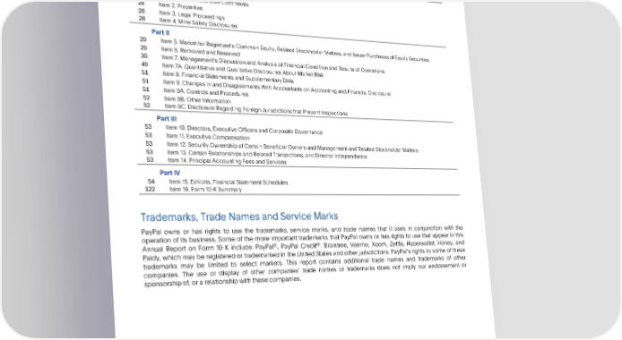 TableofContents Page PartI 2 Item1. Business 14 Item1A.RiskFactors 28 Item1B.UnresolvedStaffComments 28 Item2.Properties 28 Item3.LegalProceedings 28 Item4.MineSafetyDisclosures PartII 29 Item5.MarketforRegistrantsCommonEquity,RelatedStockholderMatters,andIssuerPurchasesofEquitySecurities 29 Item6.RemovedandReserved 30 Item7. ManagementsDiscussionandAnalysisofFinancialConditionandResultsofOperations 49 Item7A.QuantitativeandQualitativeDisclosuresAboutMarketRisk 1 Item8.FinancialStatementsandSupplementaryData 1 Item9.ChangesinandDisagreementsWithAccountantsonAccountingandFinancialDisclosure 1 Item9A.ControlsandProcedures 2 Item9B.OtherInformation 2 Item9C.DisclosureRegardingForeignJurisdictionsthatPreventInspections PartIII 3 Item10. Directors, Executive Officers and Corporate Governance 3 Item11. Executive Compensation 3 Item12. Security Ownershipof Certain Beneficial Owners and ManagementandRelatedStockholderMatters 3 Item13. Certain Relationships and Related Transactions, and Director Independence 3 Item14. Principal AccountingFees and Services PartIV 4 Item15. Exhibits, Financial Statement Schedules 122 Item16. Form10-KSummary Trademarks,TradeNamesandServiceMarks PayPal owns or has rights to use the trademarks, service marks, and trade names that it uses in conjunction with the operation of its business. Some of the more important trademarks that PayPal owns or has rights to use that appear in this ® ® Annual Report on Form 10-K include: PayPal , PayPal Credit , Braintree, Venmo, Xoom, Zettle, Hyperwallet, Honey, and Paidy, which may be registered or trademarkedin the United States and other jurisdictions. PayPals rights to some of these trademarks may be limited to select markets. This report contains additional trade names and trademarks of other companies. The use or display of other companies trade names or trademarks does not imply our endorsement or sponsorshipof,orarelationshipwiththesecompanies.