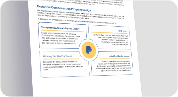 COMPENSATIONDISCUSSIONANDANALYSIS ExecutiveSummary At our 2022AnnualMeetingofStockholders,over88%ofthevotescastsupportedoursay-on-payproposal.Followingthe 2022AnnualMeetingofStockholders,weengagedinproactiveoutreacheffortswithstockholdersrepresenting approximately52%ofourcommonstock.Formoreinformationonourengagementeffortsandfeedbackreceivedthrough theseconversations,see“CorporateGovernance–StockholderEngagement,”onpage31ofthisproxystatement. After consideringthe 2022say-on-payresultsaswellasthefeedbackreceivedthroughourstockholderengagement program,theCompensationCommitteedeterminedthattheCompanysexecutivecompensationphilosophiesand objectivesandcompensationelementscontinuedtobeappropriateanddidnotmakeanychangestotheCompanys executivecompensationprograminresponsetothe2022say-on-payvote. ExecutiveCompensationProgramDesign Ourkeyguidingprincipleforexecutivecompensationistocloselyalignthecompensationofourexecutiveswiththe creationof long-termvaluefor our stockholders.WedosobytyingasignificantportionofourexecutivesTargetTotal Direct CompensationopportunitytotheCompanysperformance. In designingour executivecompensationprogram,theCompensationCommitteeprioritizesfourgoals: Transparency, Simplicity and Clarity One Team Enable executives to directly link between Maintain unified goals and objectives of the annual Company and individual performance and their short- and long-term incentive programs for pay, and enable stockholders to directly link the entire executive leadership team to between returns on their investment and drive aligned operational decisions and pay outcomes to Company performance. Company performance. Winning the War For Talent Individual Performance Recognize the unique space in which we Deliver compensation commensurate with compete and prioritize nimble and aggressive results, both on the upside and downside, and compensation strategies to attract and retain key hold leaders accountable for their performance, talent. including with respect to risk and compliance and DIE&B within their respective organizations. 54 •2023ProxyStatement
