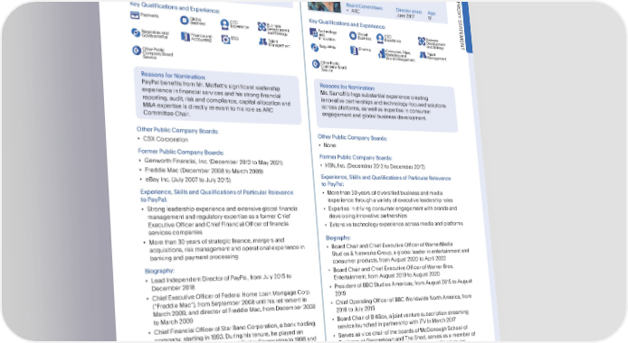 PROPOSAL1:ELECTIONOFDIRECTORS Director Biographies DAVIDM.MOFFETT ANNM.SARNOFF FormerChiefExecutiveOfficerofFederal FormerBoardChairandChiefExecutiveOfficer HomeLoanMortgageCorp. of WarnerMediaStudios&NetworksGroup INDEPENDENT INDEPENDENT PRO BoardCommittees: Directorsince: Age: •ARC(Chair)(Audit June2015 71 BoardCommittees: Directorsince: Age: XY CommitteeFinancialExpert) •ARC June2017 61 S T A KeyQualificationsandExperience: KeyQualificationsandExperience: TEMENT Payments Global CEO Business Technology Global CEO Business Business Experience Development and Business Experience Development and Strategy Innovation and Strategy Regulatory and Finance and ESG Talent Regulatory Finance Consumer, Sales, Talent Governmental Accounting Management Marketing and Management Brand Management Other Public Other Public Company Board Company Board Service Service ReasonsforNomination: ReasonsforNomination: PayPal benefits from Mr. Moffetts significant leadership Ms.Sarnoffbringssubstantialexperiencecreating experienceinfinancialservices and his strong financial innovative partnerships and technology-focusedsolutions reporting, audit, risk and compliance, capital allocation and across platforms, as well as expertise in consumer M&AexpertiseisdirectlyrelevanttohisroleasARC engagementandglobalbusinessdevelopment. CommitteeChair. OtherPublicCompanyBoards: OtherPublicCompanyBoards: • CSXCorporation • None FormerPublicCompanyBoards: FormerPublicCompanyBoards: • GenworthFinancial,Inc.(December2012toMay2021) • HSN,Inc.(December2012toDecember2017) • FreddieMac(December2008toMarch2009) Experience,SkillsandQualificationsofParticularRelevance • eBayInc.(July2007toJuly2015) to PayPal: Experience,SkillsandQualificationsofParticularRelevance • Morethan30yearsofdiversifiedbusinessandmedia to PayPal: experiencethroughavarietyofexecutiveleadershiproles • Strongleadershipexperienceandextensiveglobalfinancial • Expertise in driving consumer engagementwithbrandsand managementandregulatoryexpertiseasaformerChief developinginnovativepartnerships ExecutiveOfficerandChiefFinancialOfficeroffinancial • Extensivetechnologyexperienceacrossmediaandplatforms services companies • Morethan30yearsofstrategicfinance,mergersand Biography: acquisitions, risk management and operational experience in • BoardChairandChiefExecutiveOfficerofWarnerMedia bankingandpaymentprocessing Studios&NetworksGroup,agloballeaderinentertainmentand Biography: consumerproducts,fromAugust2020toApril2022 • LeadIndependentDirectorofPayPal,fromJuly2015to • BoardChairandChiefExecutiveOfficerofWarnerBros. December2018 Entertainment,from August2019toAugust2020 • ChiefExecutiveOfficerofFederalHomeLoanMortgageCorp. • President of BBC Studios Americas, from August 2015 to August (“Freddie Mac”), from September 2008untilhis retirementin 2019 March2009,anddirectorofFreddieMac,fromDecember2008 • ChiefOperatingOfficerofBBCWorldwideNorthAmerica,from to March2009 2010toJuly2015 • ChiefFinancialOfficerof Star Banc Corporation, a bank holding • BoardChairofBritBox,ajointventuresubscriptionstreaming company,startingin1993.Duringhistenure,heplayedan service launchedinpartnershipwithITVinMarch2017 integral role in the acquisition of Firstar Corporation in 1998 and • ServesasvicechairoftheboardsofMcDonoughSchoolof later U.S. Bancorp in 2001. Mr. Moffett remained Chief Financial BusinessatGeorgetownandTheShed,servesasamemberof Officer of U.S. Bancorp until 2007 the boards of directors of Realm Media and WTA Ventures • ServesasaTrusteeforColumbiaThreadneedleMutualFunds andUniversityofOklahomaFoundationandasaconsultantto various financial services companies •2023ProxyStatement 19