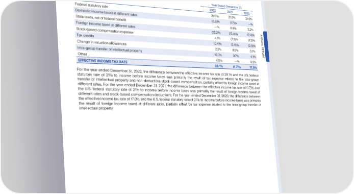 PARTIV Note16—IncomeTaxes PayPalHoldings,Inc. NotestoConsolidatedFinancialStatements—(Continued) Thefollowingisareconciliationof thedifferencebetweentheeffectiveincometaxrateandthefederalstatutoryrate: YearEndedDecember31, 2022 2021 2020 Federalstatutoryrate 21.0% 21.0% 21.0% Domesticincometaxedatdifferentrates (0.6)% (1.7)% —% State taxes, net of federal benefit —% 0.9% 2.2% Foreignincometaxedatdifferentrates (12.2)% (13.4)% (7.4)% ANNU Stock-basedcompensationexpense 4.1% (7.3)% (1.2)% AL Taxcredits (0.4)% (2.4)% (2.0)% REPOR Changeinvaluationallowances 2.2% 0.5% 0.1% Intra-group transfer of intellectual property 10.0% 0.7% 4.1% T Other 4.0% —% 0.2% EFFECTIVEINCOMETAXRATE 28.1% (1.7)% 17.0% For the year ended December 31, 2022, the difference between the effective income tax rate of 28.1% and the U.S. federal statutory rate of 21% to income before income taxes was primarily the result of tax expense related to the intra-group transfer of intellectual property and non-deductible stock-based compensation, partially offset by foreign income taxed at different rates. For the year ended December 31, 2021, the difference between the effective income tax rate of (1.7)% and the U.S. federal statutory rate of 21% to income before income taxes was primarily the result of foreign income taxed at different rates and stock-based compensation deductions. For the year ended December 31, 2020, the difference between the effective income tax rate of 17.0% and the U.S. federal statutory rate of 21% to income before income taxes was primarily the result of foreign income taxed at different rates, partially offset by tax expense related to the intra-group transfer of intellectual property. •2022AnnualReport 113