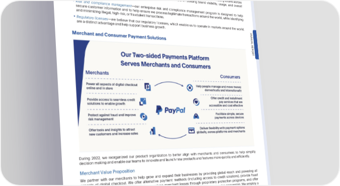 PARTI Item1. Business around the world. A market is a geographic area or political jurisdiction, such as a country, territory, or protectorate, in whichweoffersomeorallofourproductsandservices.Acountry,territory,orprotectorateis identifiedby a distinctset of laws and regulations.In 2022, we processed$1.36 trillion of TPV. • Trusted brands—we have built and strengthened well-recognized and trusted brands, including PayPal, Braintree, Venmo, Xoom, Hyperwallet, PayPal Zettle, PayPal Honey, and Paidy. Our communications and marketing efforts across multiple geographies and demographic groups play an important role in building brand visibility, usage, and overall preferenceamongcustomers. • Risk and compliance management—our enterprise risk and compliance management program is designed to help secure customer information and to help ensure we process legitimate transactions around the world, while identifying andminimizingillegal,high-risk,or fraudulenttransactions. • Regulatory licenses—we believe that our regulatory licenses, which enable us to operate in markets around the world, are a distinct advantageand help supportbusinessgrowth. ANNU AL MerchantandConsumerPaymentSolutions REPOR T During 2022, we reorganized our product organization to better align with merchants and consumers to help simplify decisionmakingandenableourteamstoinnovateandlaunchnewproductsandfeaturesmorequicklyandefficiently. MerchantValueProposition We partner with our merchants to help grow and expand their businesses by providing global reach and powering all aspects of digital checkout. We offer alternative payment methods (including access to credit solutions), provide fraud prevention and risk management solutions, reduce merchant losses through proprietary protection programs, and offer tools and insights for utilizing data analytics to attract and engage customers and improve sales conversion. We employ a technology and platform agnostic approach intended to enable merchants of all sizes to quickly and easily provide digital checkout online, including through PayPal-branded checkout and unbranded card processing (primarily consisting of Braintree), as well as in-store at the point of sale, across all platforms and devices, and to securely and simply receive paymentsfromtheircustomers. PayPals payments platform enables merchants to accept all types of online and offline payments, including those made with the PayPal and Venmo digital wallets, our consumer credit products, credit cards and debit cards, and competing digital wallets, as well as other popular local payment methods. Our diversified suite of products and services is tailored to meet the needs of merchants regardless of their size or business complexity. We have expanded our merchant value proposition to enable payment acceptance at the point of sale through our PayPal and Venmo digital wallets and our •2022AnnualReport 5