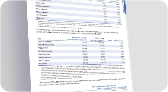 COMPENSATIONDISCUSSIONANDANALYSIS AnnualIncentivePlan Thefollowingtablesetsforththe2022targetannualincentiveopportunity(the“TargetIncentiveAmount”)foreach participatingNEO,whichisexpressedasapercentageoftheNEOsbasesalary. 2022AIPAnnual 2021AIPAnnual TargetasPercentage TargetasPercentage PRO NEO of BaseSalary of BaseSalary XY DanielH.Schulman 200% 200% S T 1 A Gabrielle Rabinovitch 125% 75% TEMENT PeggyAlford 125% 125% JonathanAuerbach 125% 125% AaronKarczmer 125% 125% 2 BlakeJorgensen 125% — 3 JohnD.Rainey 125% 125% MarkBritto 125% 125% 1 Ms.Rabinovitchs2022AIPAnnualTargetwaschangedfrom75%to125%atthetimesheassumedtheroleofactingChiefFinancialOfficer. 2 Mr. Jorgensens2022AIPAnnualTargetwasestablishedatthetimehejoinedtheCompany,andhewaseligibleforaprorated2022AIPbasedonhisstartdaterelativetothe performanceperiod. 3 Mr. Rainey ceasedtoparticipateinthe2022AIPuponhisresignationfromtheCompany. 75%oftheTargetIncentiveAmountforeachNEOwasdeliveredintheformofPBRSUswithaone-yearperformance period, with the final payout to be determinedbased on Companyperformancefor2022. BaseSalaryUsedto PBRSUTarget 1 2 NEO CalculatePBRSUTarget ($) IncentiveAmount($) PBRSUTarget (Shares) DanielH.Schulman 1,250,000 1,875,000 11,715 1 Gabrielle Rabinovitch 450,000 253,125 1,582 PeggyAlford 750,000 703,125 4,393 JonathanAuerbach 750,000 703,125 4,393 AaronKarczmer 750,000 703,125 4,393 1 BlakeJorgensen 750,000 294,735 3,070 3 JohnD.Rainey 750,000 703,125 4,393 MarkBritto 750,000 703,125 4,393 1 In accordancewiththetermsofthe2022AIP,eachthen-servingNEOsbasesalaryandAIPAnnualTargetasofApril1,2022wasusedtocalculatetheTargetIncentiveAmount applicabletothePBRSUsgrantedpursuanttothe2022AIP.ForMs.Rabinovitch,herbasesalaryandherAIPAnnualTarget(i.e.,75%)priortobecominganNEOwasusedto calculateherTargetIncentiveAmountapplicabletothePBRSUsgranted.ForMr.Jorgensen,hisstartingbasesalarywasusedtocalculatehisTargetIncentiveAmountapplicableto thePBRSUs,whichwasproratedbasedonhisstartdaterelativetotheperformanceperiod. 2 ThetargetnumberofPBRSUswasdeterminedbydividing(i)theTargetIncentiveAmountallocatedtotheCompanyperformanceportionby(ii)theaverageclosingpriceofPayPal commonstockforaperiodof30consecutivetradingdayspriortothegrantdate(the“AverageClosingPrice”).ThePBRSUsunderthe2022AIPweregrantedonFebruary15,2022 to eachofthethen-servingNEOsandonSeptember15,2022toMr.Jorgensen. 3 Mr. Rainey forfeited his 2022 AIP award upon his resignation from the Company. Theremaining25%oftheTargetIncentiveAmountforeachNEOwasdeterminedbasedonindividualperformance,tobe deliveredin cash,in eachcaseasdescribedbelow. BaseSalaryUsedtoCalculateCash 1 NEO TargetIncentiveAmount ($) TargetCash($) DanielH.Schulman 1,250,000 625,000 Gabrielle Rabinovitch 750,000 234,375 PeggyAlford 750,000 234,375 JonathanAuerbach 750,000 234,375 AaronKarczmer 750,000 234,375 2 BlakeJorgensen 750,000 98,245 JohnD.Rainey 750,000 234,375 MarkBritto 750,000 234,375 •2023ProxyStatement 57