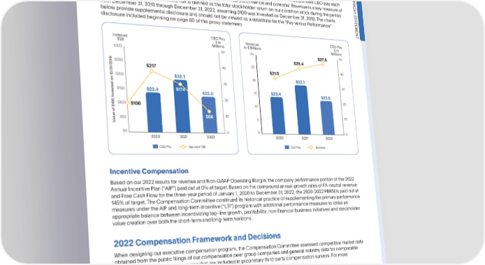 COMPENSATIONDISCUSSIONANDANALYSIS AlignmentofCompensationwithPerformanceResults AlignmentofCompensationwithPerformanceResults CEOCompensationandPerformanceTrends ThefollowingchartsdemonstratethealignmentofourrevenueandindexedTSRwithCEOpay(asreportedinthe“2022 PRO SummaryCompensationTable”)forfiscalyears2020to2022.OurCompensationCommitteedeterminesCEOpayeach yearbasedonvariousfactors,includingCompanyandindividualperformanceandpotential.Revenueisakeymeasureof XY S ourfinancial performance.IndexedTSRisdefinedasthetotalstockholderreturnonourcommonstockduringtheperiod T A fromDecember31,2019throughDecember31,2022,assuming$100wasinvestedonDecember31,2019.Thecharts TEMENT belowprovidesupplementaldisclosureandshouldnotbeviewedasasubstituteforthe“PayversusPerformance” disclosureincludedbeginningonpage80ofthisproxystatement. Indexed CEO Pay Revenue CEO Pay TSR $ in in $ Billions $ in Millions Millions $300 50 30 $27.5 50 $25.4 $250 40 25 40 $217 $21.5 $200 $32.1 20 $32.1 30 30 $150 $23.4 $174 $22.0 15 $23.4 $22.0 20 20 $100 $100 10 $50 $66 10 5 10 Value of $100 Invested on 12/31/2019 $0 0 0 0 2020 2021 2022 2020 2021 2022 CEO Pay Indexed TSR CEO Pay Revenue IncentiveCompensation Basedonour2022resultsforrevenueandNon-GAAPOperatingMargin,thecompanyperformanceportionofthe2022 AnnualIncentivePlan(“AIP”)paidoutat0%oftarget.BasedonthecompoundannualgrowthratesofFX-neutralrevenue andFreeCashFlowforthethree-yearperiodofJanuary1,2020toDecember31,2022,the2020-2022PBRSUspaidoutat 145%oftarget.TheCompensationCommitteecontinueditshistoricalpracticeofsupplementingtheprimaryperformance measuresundertheAIPandlong-termincentive(“LTI”)programwithadditionalperformancemeasurestostrikean appropriatebalancebetweenincentivizingtop-linegrowth,profitability,non-financialbusinessinitiativesand stockholder valuecreationoverboththeshort-termandlong-termhorizons. 2022CompensationFrameworkandDecisions Whendesigningourexecutivecompensationprogram,theCompensationCommitteeassessedcompetitivemarketdata obtainedfromthepublicfilingsofourcompensationpeergroupcompaniesandgeneralindustrydataforcomparable technologyandfinancialcompaniesthatareincludedinproprietarythird-partycompensationsurveys.Formore information, see “Our Structure for Setting Compensation.” BaseSalary At the beginningof eachyear,theCompensationCommitteereviewsandapproveseachthen-servingexecutiveofficers basesalaryfortheyear.Inmakingitsdeterminations,theCompensationCommitteeconsideredcompetitivemarketdata andcertainindividualfactors,includingtheexecutivesindividualperformance,levelof responsibility,breadthof knowledgeandpriorexperience.Atthetimeofhireorpromotion,theCompensationCommitteeapprovesthe compensationofthenewlyappointedorpromotedexecutiveofficerbasedonthecompetitivemarketdata,prior •2023ProxyStatement 55