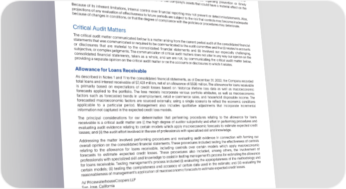 PARTIV ReportofIndependentRegisteredPublicAccountingFirm generally acceptedaccountingprinciples.A companysinternalcontroloverfinancialreportingincludesthosepoliciesand procedures that (i) pertain to the maintenance of records that, in reasonable detail, accurately and fairly reflect the transactions and dispositions of the assets of the company; (ii) provide reasonable assurance that transactions are recorded as necessary to permit preparation of financial statements in accordance with generally accepted accounting principles, and that receipts and expenditures of the company are being made only in accordance with authorizations of management and directors of the company; and (iii) provide reasonable assurance regarding prevention or timely detection of unauthorized acquisition, use, or disposition of the companys assets that could have a material effect on the financial statements. Because of its inherent limitations, internal control over financial reporting may not prevent or detect misstatements. Also, projectionsof any evaluation of effectivenessto future periods are subject to the risk that controls may become inadequate becauseofchangesinconditions,orthatthedegreeofcompliancewiththepoliciesorproceduresmaydeteriorate. Critical Audit Matters Thecritical audit matter communicated below is a matter arising from the current period audit of the consolidated financial statementsthatwascommunicatedorrequiredtobecommunicatedtotheauditcommitteeandthat(i)relatestoaccounts or disclosures that are material to the consolidated financial statements and (ii) involved our especially challenging, subjective, or complex judgments. The communicationof critical audit matters does not alter in any way our opinion on the consolidated financial statements, taken as a whole, and we are not, by communicating the critical audit matter below, providingaseparateopiniononthecriticalauditmatterorontheaccountsordisclosurestowhichitrelates. AllowanceforLoansReceivable As described in Notes 1 and 11 to the consolidated financial statements, as of December 31, 2022, the Company recorded total loans and interest receivable of $7,431 million, net of an allowance of $598 million. The allowance for loans receivable is primarily based on expectations of credit losses based on historical lifetime loss data as well as macroeconomic forecasts applied to the portfolio. The loss models incorporate various portfolio attributes, as well as macroeconomic factors such as forecasted trends in unemployment, retail e-commerce sales, and household disposable income. The forecasted macroeconomic factors are sourced externally, using a single scenario to reflect the economic conditions applicable to a particular period. Management also includes qualitative adjustments that incorporate incremental informationnotcapturedintheexpectedcreditlossmodels. The principal considerations for our determination that performing procedures relating to the allowance for loans receivable is a critical audit matter are (i) the high degree of auditor subjectivity and effort in performing procedures and evaluating audit evidence relating to certain models which apply macroeconomic forecasts to estimate expected credit losses; and (ii) the audit effort involved in the use of professionals with specialized skill and knowledge. Addressing the matter involved performing procedures and evaluating audit evidence in connection with forming our overall opinion on the consolidated financial statements. These procedures included testing the effectiveness of controls relating to the allowance for loans receivable, including controls over certain models which apply macroeconomic forecasts to estimate expected credit losses. These procedures also included, among others, the involvement of professionals with specialized skill and knowledge to assist in testing managements process for estimating the allowance for loans receivable. Testing managements process included (i) evaluating the appropriateness of the methodology and certain models; (ii) testing the completeness and accuracy of certain data used in the estimate; and (iii) evaluating the reasonablenessofmanagementsapplicationofmacroeconomicforecaststoestimateexpectedcreditlosses. /s/ PricewaterhouseCoopersLLP SanJose,California February9,2023 WehaveservedastheCompanysauditorsince2000. 56 •2022AnnualReport