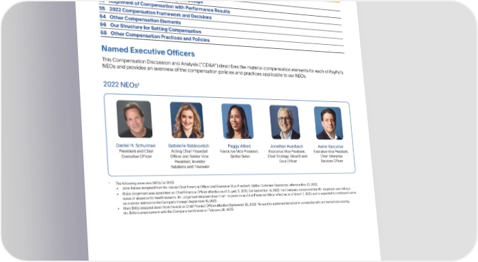 COMPENSATIONDISCUSSIONANDANALYSIS CompensationDiscussionandAnalysis TableofContents 51 ExecutiveSummary 54 ExecutiveCompensationProgramDesign 55 AlignmentofCompensationwithPerformanceResults 55 2022CompensationFrameworkandDecisions 64 OtherCompensationElements 66 OurStructureforSettingCompensation 68 OtherCompensationPracticesandPolicies NamedExecutiveOfficers This CompensationDiscussionandAnalysis(“CD&A”)describesthematerialcompensationelementsforeachofPayPals NEOsandprovidesanoverviewofthecompensationpoliciesandpracticesapplicabletoourNEOs. 1 2022NEOs DanielH.Schulman Gabrielle Rabinovitch PeggyAlford JonathanAuerbach AaronKarczmer President and Chief ActingChiefFinancial ExecutiveVicePresident, ExecutiveVicePresident, ExecutiveVicePresident, ExecutiveOfficer Officer and Senior Vice GlobalSales Chief Strategy, Growth and Chief Enterprise President, Investor DataOfficer Services Officer Relations and Treasurer 1 ThefollowingwerealsoNEOsfor2022: • JohnRaineyresignedfromhisroleasChiefFinancialOfficerandExecutiveVicePresident,GlobalCustomerOperations,effectiveMay23,2022. • BlakeJorgensenwasappointedasChiefFinancialOfficereffectiveasofAugust3,2022.OnSeptember14,2022,theCompanyannouncedthatMr.Jorgensenwastakinga leaveofabsenceforhealthreasons.Mr.JorgensensteppeddownfromhispositionasChiefFinancialOfficereffectiveasofMarch7,2023,andisexpectedtocontinuetoserve asasenioradvisortotheCompanythroughSeptember15,2023. • MarkBrittosteppeddownfromhisroleasChiefProductOfficereffectiveSeptember26,2022.Pursuanttoaplannedtransitioninconnectionwithaninternalrestructuring, Mr. Brittos employmentwiththeCompanyterminatedonFebruary28,2023. 50 •2023ProxyStatement
