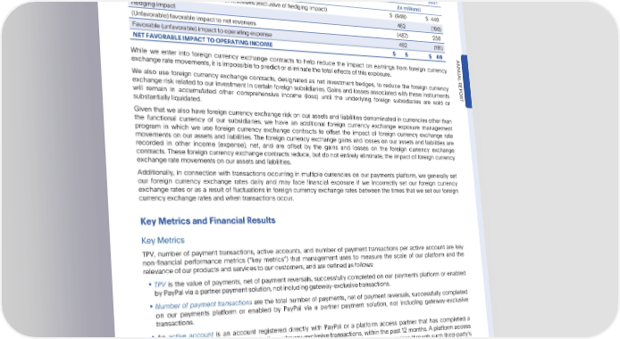 PARTII Item7. ManagementsDiscussionandAnalysisofFinancialConditionandResultsofOperations In the years ended December31, 2022 and 2021, the year-over-yearforeign currency exchangerate movementsrelativeto theU.S.dollarhadthefollowingimpactonourreportedresults: YearEndedDecember31, 2022 2021 (In millions) (Unfavorable)favorableimpacttonetrevenues(exclusiveofhedgingimpact) $ (949) $ 440 Hedgingimpact 462 (190) (Unfavorable)favorableimpacttonetrevenues (487) 250 Favorable(unfavorable)impacttooperatingexpense 492 (181) NETFAVORABLEIMPACTTOOPERATINGINCOME $ 5 $ 69 ANNU While we enter into foreign currency exchange contracts to help reduce the impact on earnings from foreign currency exchangeratemovements,itisimpossibletopredictoreliminatethetotaleffectsofthisexposure. AL Wealso use foreign currency exchange contracts, designated as net investment hedges, to reduce the foreign currency REPOR exchangerisk related to our investment in certain foreign subsidiaries. Gains and losses associated with these instruments will remain in accumulated other comprehensive income (loss) until the underlying foreign subsidiaries are sold or T substantially liquidated. Given that we also have foreign currency exchange risk on our assets and liabilities denominated in currencies other than the functional currency of our subsidiaries, we have an additional foreign currency exchange exposure management program in which we use foreign currency exchange contracts to offset the impact of foreign currency exchange rate movements on our assets and liabilities. The foreign currency exchange gains and losses on our assets and liabilities are recorded in other income (expense), net, and are offset by the gains and losses on the foreign currency exchange contracts. These foreign currency exchange contracts reduce, but do not entirely eliminate, the impact of foreign currency exchangeratemovementsonourassetsandliabilities. Additionally, in connection with transactions occurring in multiple currencies on our payments platform, we generally set our foreign currency exchange rates daily and may face financial exposure if we incorrectly set our foreign currency exchange rates or as a result of fluctuations in foreign currency exchange rates between the times that we set our foreign currencyexchangeratesandwhentransactionsoccur. KeyMetricsandFinancialResults KeyMetrics TPV, number of payment transactions, active accounts, and number of payment transactions per active account are key non-financial performance metrics (“key metrics”) that management uses to measure the scale of our platform and the relevanceofourproductsandservicestoourcustomers,andaredefinedasfollows: • TPV is the value of payments, net of payment reversals, successfully completed on our payments platform or enabled byPayPalviaapartnerpaymentsolution,notincludinggateway-exclusivetransactions. • Number of payment transactions are the total number of payments, net of payment reversals, successfully completed on our payments platform or enabled by PayPal via a partner payment solution, not including gateway-exclusive transactions. • An active account is an account registered directly with PayPal or a platform access partner that has completed a transaction on our platform, not including gateway-exclusive transactions, within the past 12 months. A platform access partner is a third party whose customers are provided access to PayPals platform or services through such third-partys login credentials, including individuals and entities that utilize Hyperwallets payout capabilities. A user may register on our platform to access different products and may register more than one account to access a product. Accordingly, a user may have more than one active account. The number of active accounts provides management with additional perspectiveontheoverallscaleofourplatform,butmaynothaveadirectrelationshiptoouroperatingresults. • Number of payment transactions per active account reflects the total number of payment transactions within the previous 12-month period, divided by active accounts at the end of the period. The number of payment transactionsper active account provides management with insight into the average number of times an account engages in payments activity on our payments platform in a given period. The number of times a consumer account or a merchant account transactsonourplatformmayvarysignificantlyfromtheaveragenumberofpaymenttransactionsperactiveaccount. •2022AnnualReport 33