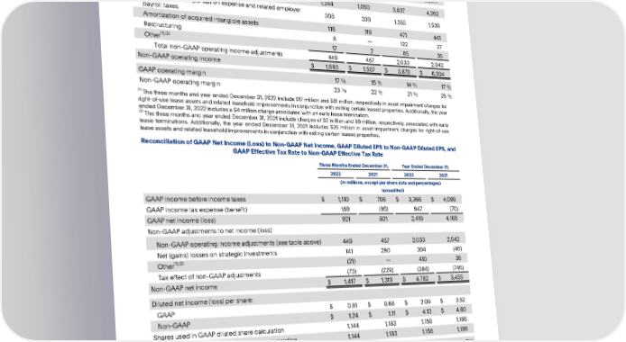 PayPal Holdings, Inc. Reconciliation of GAAP Operating Income to Non-GAAP Operating Income and GAAP Operating Margin to Non-GAAP Operating Margin Three Months Ended December 31, Year Ended December 31, 2022 2021 2022 2021 (In millions, except percentages) (unaudited) GAAP net revenues $ 7,383 $ 6,918 $ 27,518 $ 25,371 GAAP operating income 1,244 1,050 3,837 4,262 Stock-based compensation expense and related employer 308 339 1,355 1,539 payroll taxes Amortization of acquired intangible assets 116 116 471 441 Restructuring 8 — 122 27 (1),(2) Other 17 2 85 35 Total non-GAAP operating income adjustments 449 457 2,033 2,042 Non-GAAP operating income $ 1,693 $ 1,507 $ 5,870 $ 6,304 GAAP operating margin 17 % 15 % 14 % 17 % Non-GAAP operating margin 23 % 22 % 21 % 25 % (1) The three months and year ended December 31, 2022 include $17 million and $81 million, respectively in asset impairment charges for right-of-use lease assets and related leasehold improvements in conjunction with exiting certain leased properties. Additionally, the year ended December 31, 2022 includes a $4 million charge associated with an early lease termination. (2) The three months and year ended December 31, 2021 include charges of $2 million and $9 million, respectively, associated with early lease terminations. Additionally, the year ended December 31, 2021 includes $26 million in asset impairment charges for right-of-use lease assets and related leasehold improvements in conjunction with exiting certain leased properties. Reconciliation of GAAP Net Income (Loss) to Non-GAAP Net Income, GAAP Diluted EPS to Non-GAAP Diluted EPS, and GAAP Effective Tax Rate to Non-GAAP Effective Tax Rate Three Months Ended December 31, Year Ended December 31, 2022 2021 2022 2021 (In millions, except per share data and percentages) (unaudited) GAAP income before income taxes $ 1,110 $ 706 $ 3,366 $ 4,099 GAAP income tax expense (benefit) 189 (95) 947 (70) GAAP net income (loss) 921 801 2,419 4,169 Non-GAAP adjustments to net income (loss): Non-GAAP operating income adjustments (see table above) 449 457 2,033 2,042 Net (gains) losses on strategic investments 141 290 304 (46) (1),(2) Other (21) — 410 36 Tax effect of non-GAAP adjustments (73) (229) (384) (746) Non-GAAP net income $ 1,417 $ 1,319 $ 4,782 $ 5,455 Diluted net income (loss) per share: GAAP $ 0.81 $ 0.68 $ 2.09 $ 3.52 Non-GAAP $ 1.24 $ 1.11 $ 4.13 $ 4.60 Shares used in GAAP diluted share calculation 1,144 1,183 1,158 1,186 Shares used in non-GAAP diluted share calculation 1,144 1,183 1,158 1,186 GAAP effective tax rate 17 % (13) % 28 % (2) % Tax effect of non-GAAP adjustments to net income (loss) — % 22 % (12) % 13 % Non-GAAP effective tax rate 17 % 9 % 16 % 11 % (1) The three months and year ended December 31, 2022 consist primarily of tax (benefit) expense related to the intra-group transfer of intellectual property. (2) The year ended December 31, 2021 consists primarily of $43 million in tax expense related to intra-group transfer of intellectual property and $11 million in tax benefit related to the write-off of deferred tax liabilities on strategic investments as a result of acquiring the remaining interest in the investments during the period. Q4 & FY 2022 Results 16