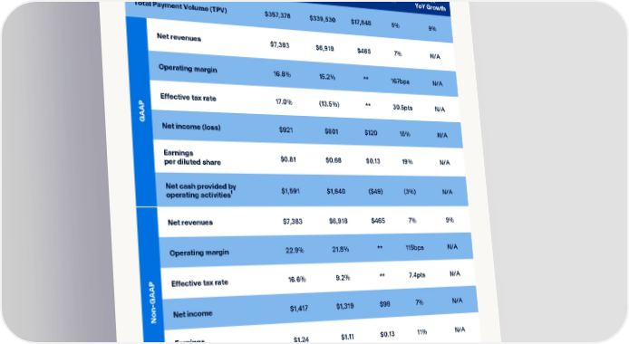 Q4'22 Financial and Operating Highlights FXN Presented in millions, except per share data and Q4 2022 Q4 2021 YoY Growth percentages YoY Growth Total Payment Volume (TPV) $357,378 $339,530 $17,848 5% 9% Net revenues $7,383 $6,918 $465 7% N/A Operating margin 16.8% 15.2% ** 167bps N/A Effective tax rate 17.0% (13.5%) ** 30.5pts N/A P A A G Net income (loss) $921 $801 $120 15% N/A Earnings $0.81 $0.68 $0.13 19% N/A per diluted share Net cash provided by $1,591 $1,640 ($49) (3%) N/A 1 operating activities Net revenues $7,383 $6,918 $465 7% 9% Operating margin 22.9% 21.8% ** 115bps N/A P Effective tax rate 16.6% 9.2% ** 7.4pts N/A A A G - n o Net income $1,417 $1,319 $98 7% N/A N Earnings $1.24 $1.11 $0.13 11% N/A per diluted share 1 Free cash flow $1,433 $1,427 $6 —% N/A 1. Beginning with the fourth quarter of 2022, we reclassified certain cash flows related to our collateral security arrangements for derivative instruments from cash flows from operating activities to cash flows from investing activities and cash flows from financing activities within Q4 & FY 2022 Results 5 the condensed consolidated statements of cash flows. See the section titled “Cash Flow Reclassification” for further details. ** Not meaningful